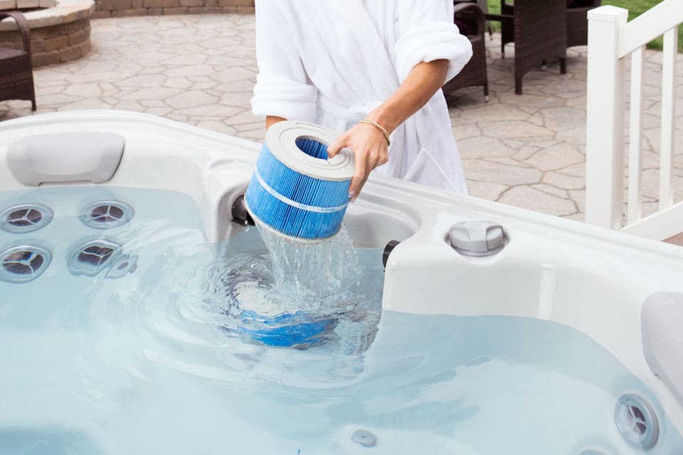 Each month remove the spa filter and clean it thoroughly. All this involves is removing the filter, lightly spraying it with a hose, and allowing it to dry completely before putting it back in the spa. You can also soak filters in a filter cleaner to ensure the removal of all dirt and debris buildup. It’s also a good idea to have a spare filter on hand so you can use the hot tub while the cleaned filter is drying. The actual cleaning only takes 10 to 15 minutes.